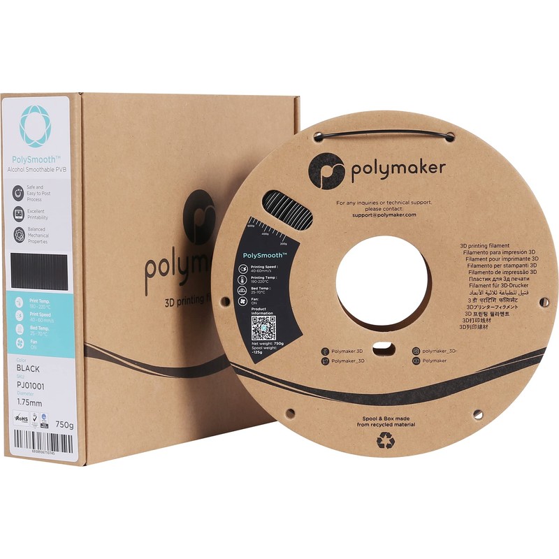 Polymaker PolySmooth PVB Filament 1.75mm Black Filament, 750g Cardboard Spool - Black PVB Filament Print Like PLA Filament 1.75, Easy Smoothable Post Process with IPA Alcohol, Work with Polysher