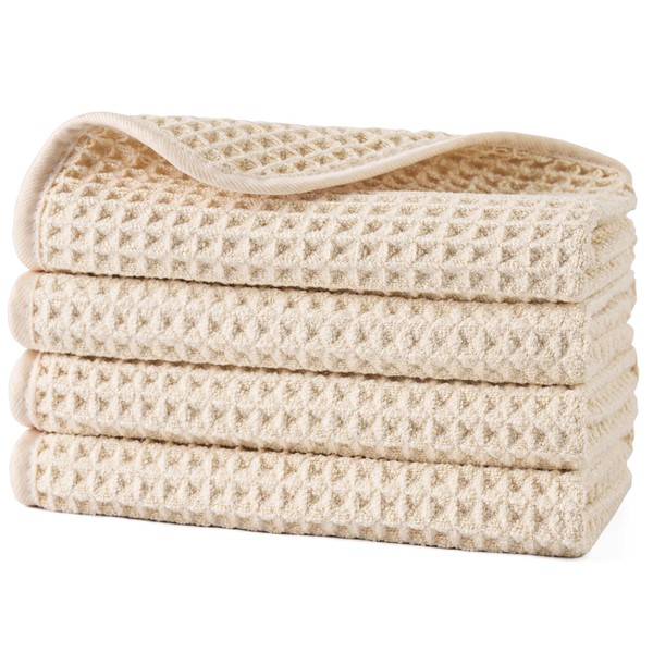 POLYTE Microfiber Lint Free Washcloth Face Towel, 13 x 13 in, 4 Pack (Light Beige, Waffle Weave)