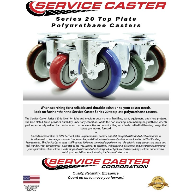 - These Service Caster Series #20 Polyurethane casters offer various wheel sizes and mounting heights: 3” Wheel: 4-1/8” mounting height; 3-1/2” wheel: 4-5/8” mounting height; 4” wheel: 5-1/8” mounting height; 5” wheel: 6-1/8” mounting height; 6” wheel: 7-1/8” mounting height. Wheels are offered in five different colors – Gray, Blue, Black, Maroon, and Red.