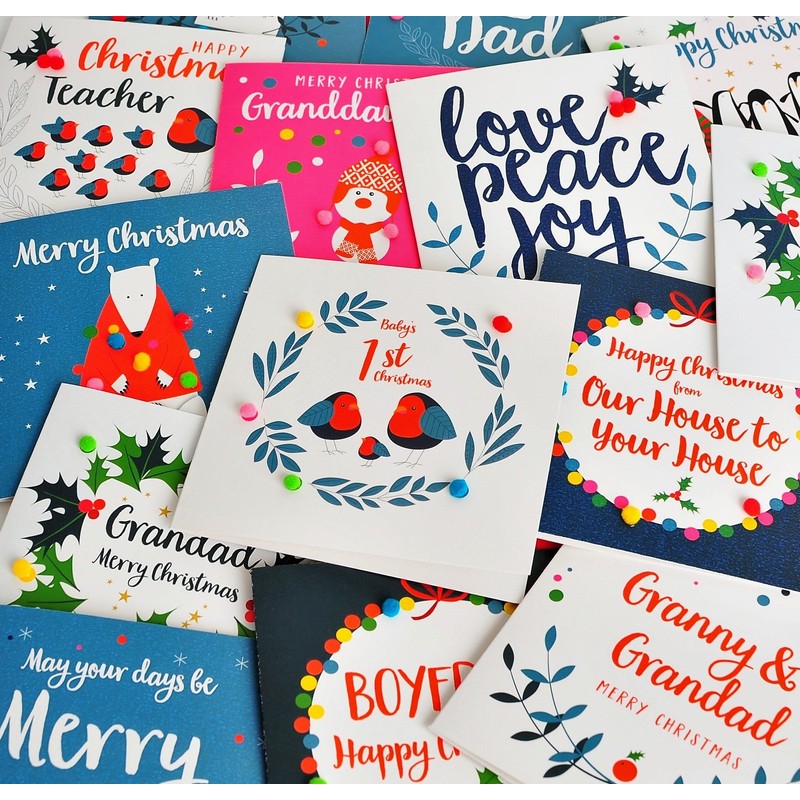 - Part of the Pom Pom Christmas range. Printed and hand finished in the U.K with beautiful colourful pompom embellishments.