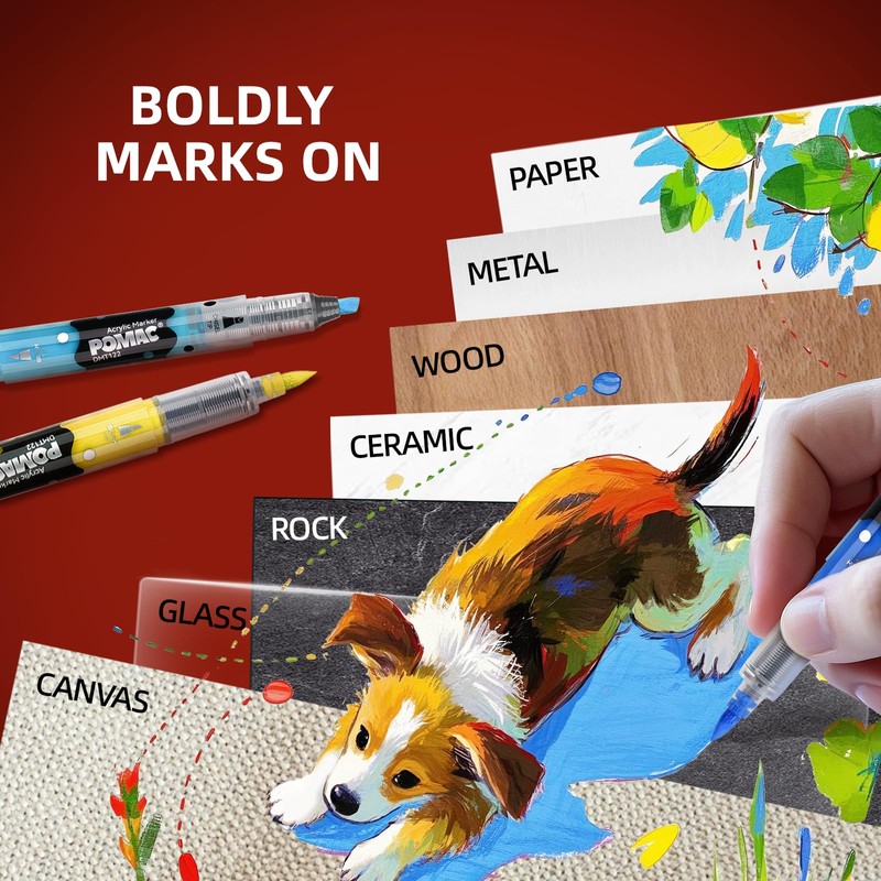 POMAC Dual-Tip Acrylic Markers, 12 Pack Art Drawing Acrylic Markers for Fabric, Canvas, Rock, Glass, Wood, Paper, DIY Crafts, School and Art