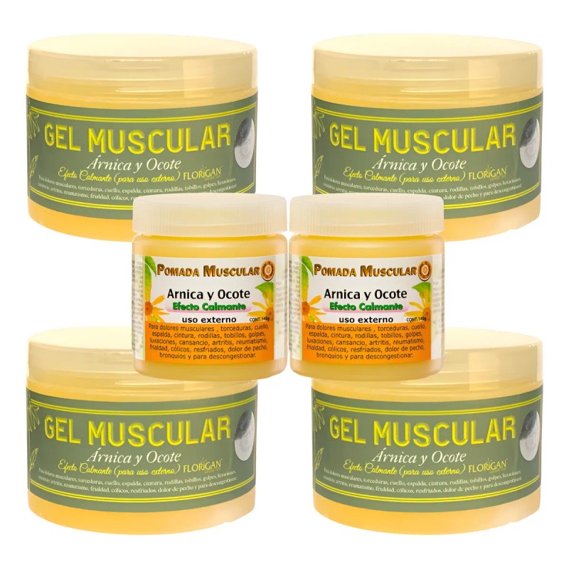 Pomada Muscular ÁRNICA y OCOTE Efecto Calmante 140grs. *2 + 4 Gel Muscular Efecto Calmante ÁRNICA y OCOTE 350grs. Línea Auxilio y Descanso Corporal Florigan®