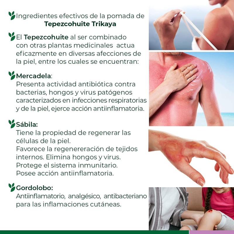 - Pomada elaborada con plantas medicinales como tepezcohuite, mercadela, árnica, sábila y gordolobo. Cada una de ellas auxilia a que la piel quemada esté libre de bacterias, se desinflame, ayuda con las molestias causadas por las quemaduras de sol o fuego.