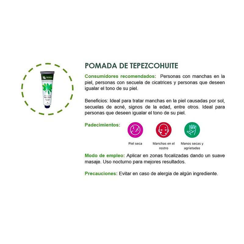 • Consumidores recomendados: Personas con manchas en la piel, personas con secuela de cicatrices y personas que deseen igualar el tono de su piel.
