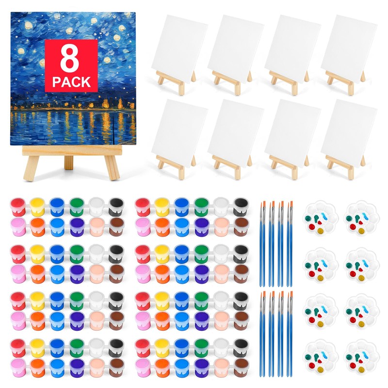 pomaylor 8 Pack 8 * 10In Canvas Boards for Painting, Art Canvas for Drawing with 16 Brushes & 8 Paint Trays & 16 Acrylic Paint, Mini Painting Canvas with Easel Set, Painting Kits for Adults & Kids Party