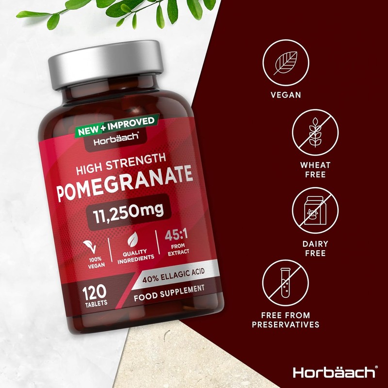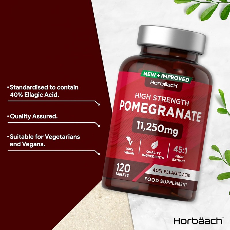 Pomegranate Tablets 11,250mg | 120 Vegan Tablets | High Strength Supplement with 100mg Ellagic Acid | 45:1 Extract Formula | No Artificial Preservatives | by Horbaach