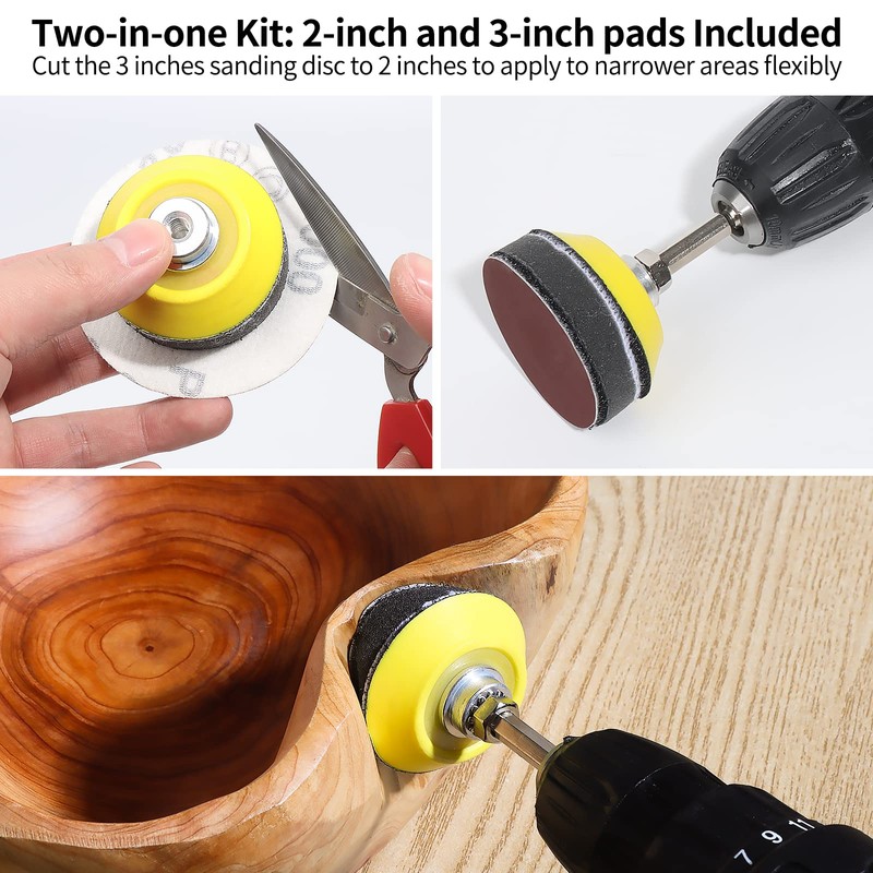 - 【Three Methods for Sanding Different Surfaces】1. 3-inch sanding disc + 2-inch backing pad: The edges of the sandpaper fit curved surfaces more flexibly, making surface sanding easier; 2. 3-inch sanding disc + 3-inch backing pad: Larger size disc handles sanding job faster and more efficiently; 3. Cut 3-inch sanding disc into 2-inch and stick it on a 2-inch pad to sand narrow areas conveniently.