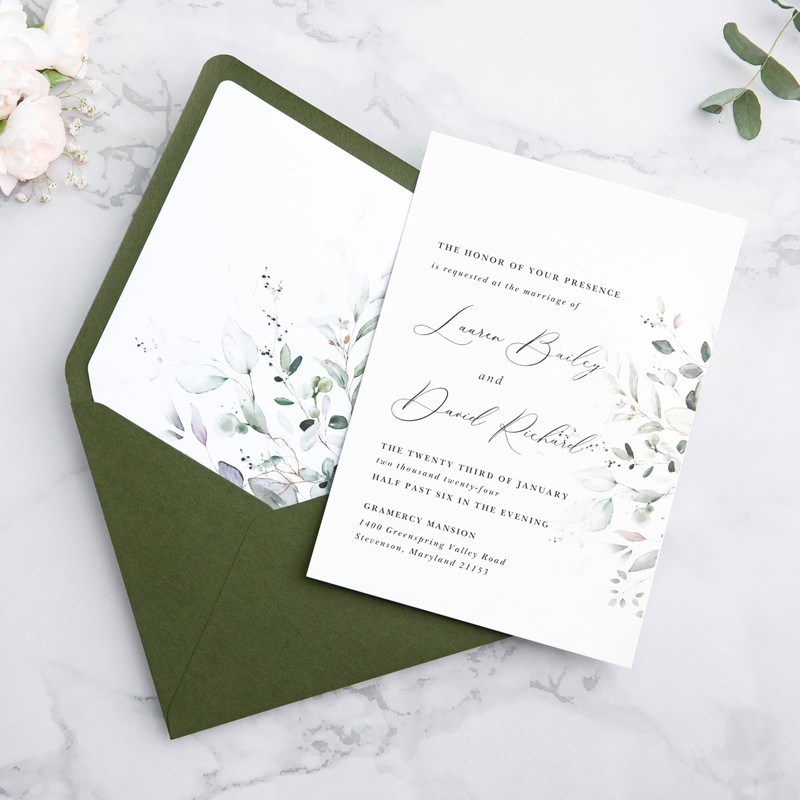 - 💌 Color: Olive Green A7 Euro Flap Envelopes with green leaves liner. The envelope is made with a 120gsm(32lb) outer layer and a 120g 32lb flower printed inner liner.