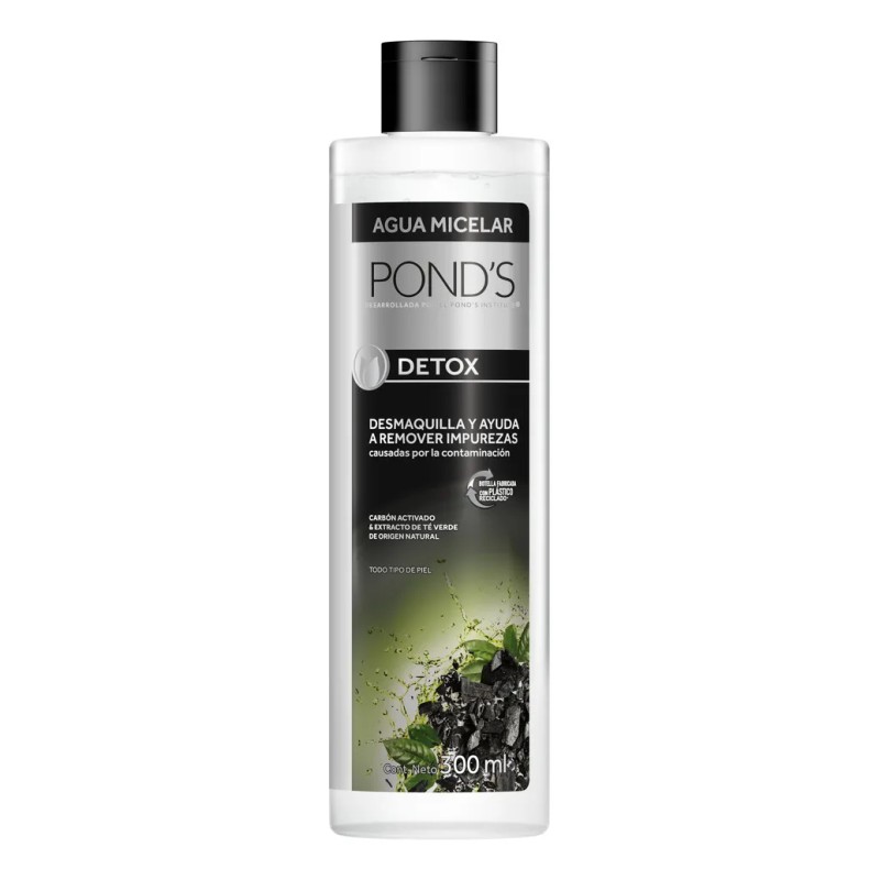Agua Micelar Detox Pond's con carbón activado que es reconocido por su acción adsorbente limpia y remueve las impurezas de la piel.