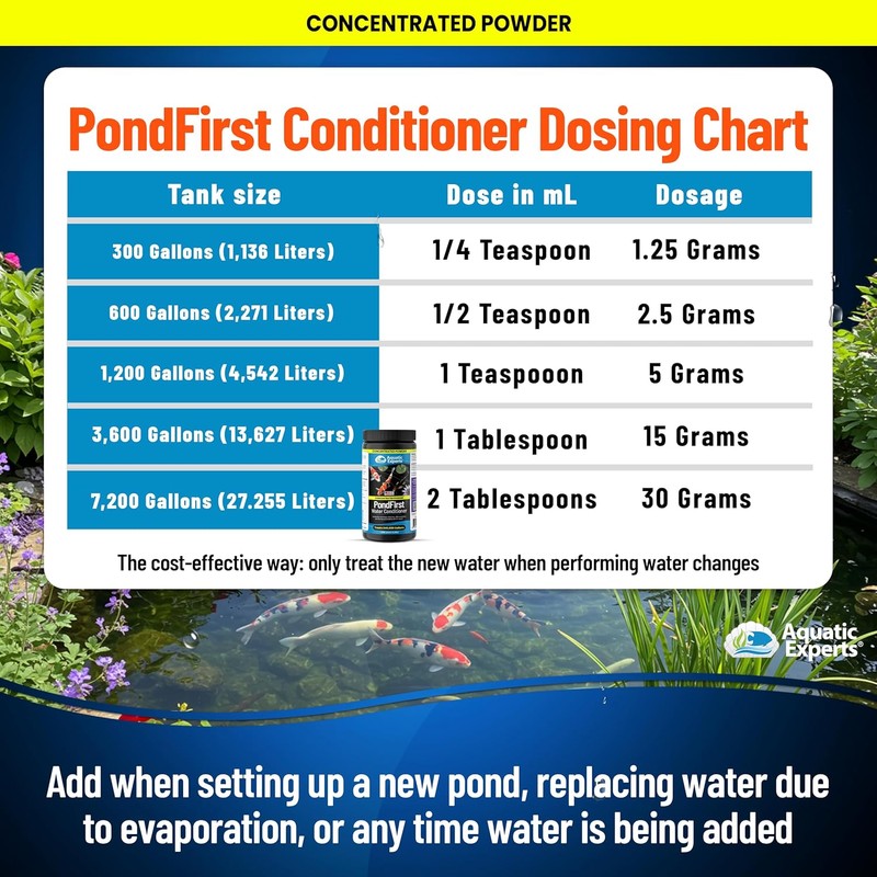 REMARKABLE RESULTS! Use PondFirst water treatment when adding water lost through evaporation, during water changes, and also when ammonia and/or nitrite levels are measurable.