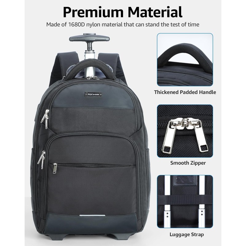 Ponhog Rolling Backpack, 30L Travel Laptop Backpack with Wheels, 15.6 Inch Roller Carry on Luggage with USB Charging Port, Flight Approved Personal Item Wheeled Suitcase for Men Women Adults, Black