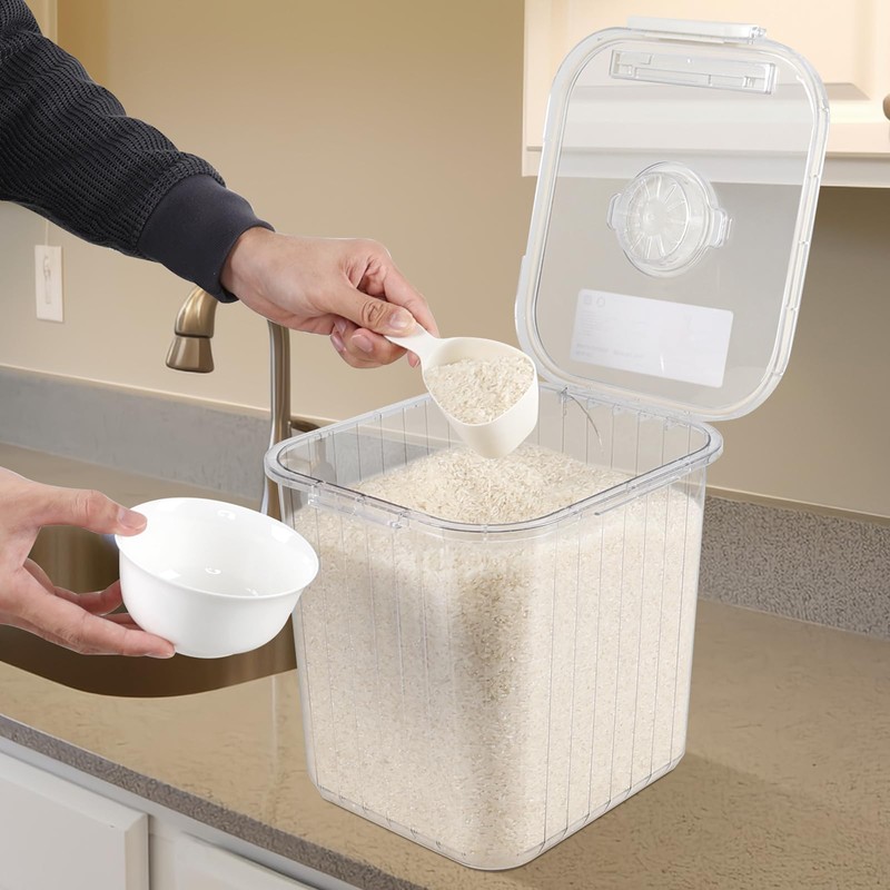 Ponpong Airtight Tall Food Storage Container, Rice Container Storage with Measuring Cup, Clear