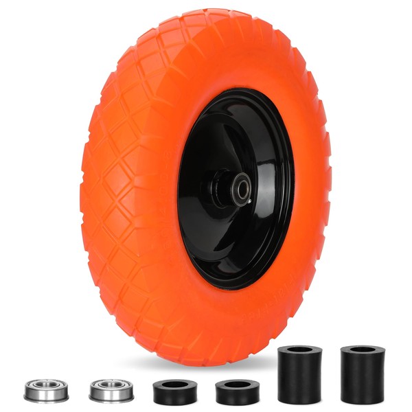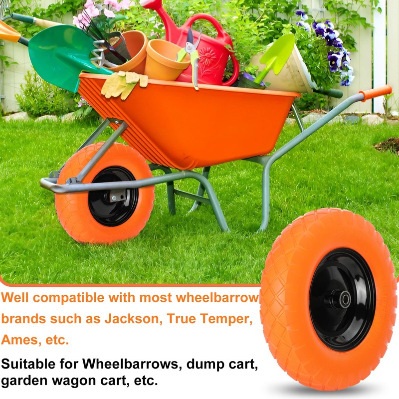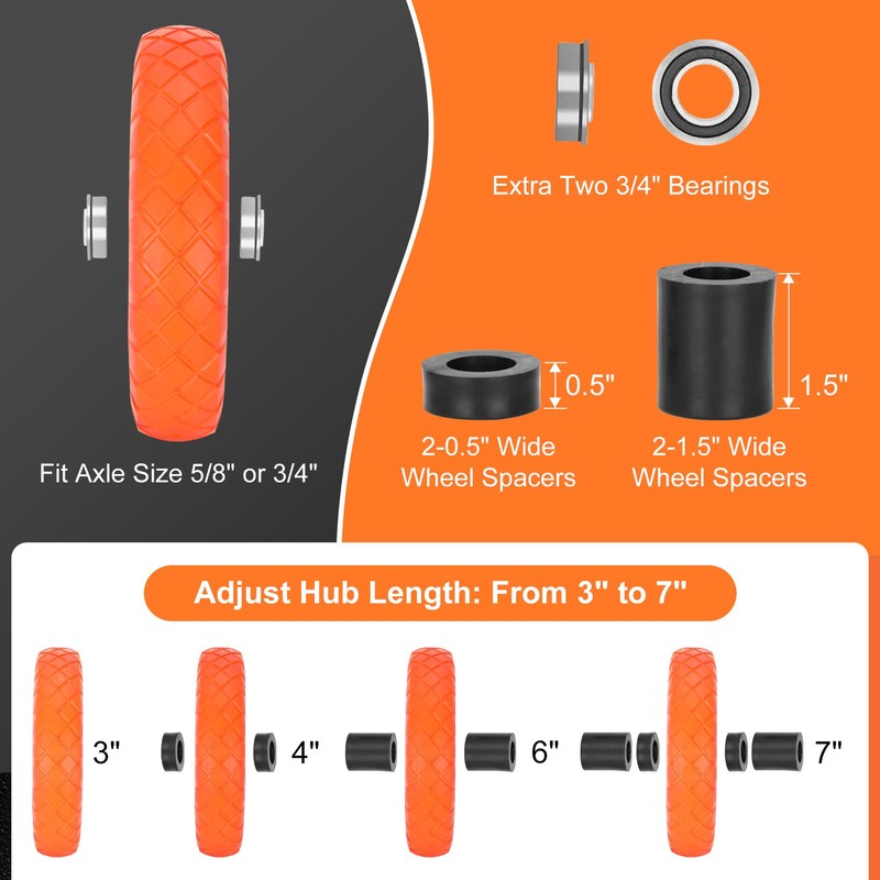- Excellent design: Considering that the wheel and bearing sizes of different wheelbarrows are different, in order to make it more convenient for customers to design the wheel length to 3",the bearing size is 5/8 inch. We also added extension spacers and 3/4" bearings to it, this 16" flat-free wheel is almost universal For all wheelbarrow types with hub length between 3" and 7".