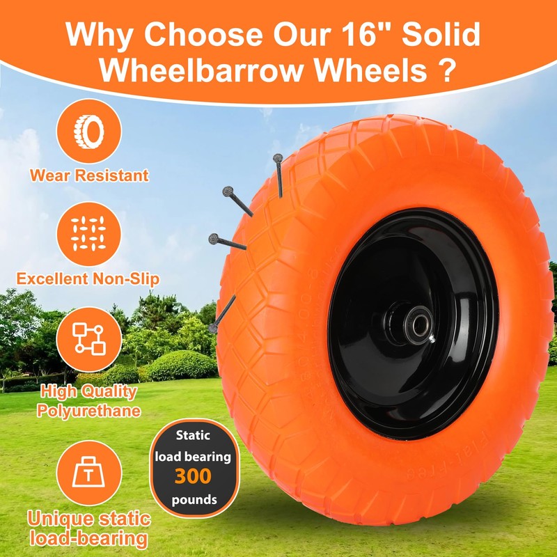 - The ideal flat free tires:Unlike traditional flat free tires that struggle to withstand static loads, one of the key advantages of our upgraded 16" flat free wheelbarrow tires are its exceptional static load capacity. It effectively addresses long-standing issues customers have faced with flat free wheels, such as their inability to bear static loads and tendency to deform under such loads. With a static load capacity of up to 300 pounds, it offers a perfect solution.