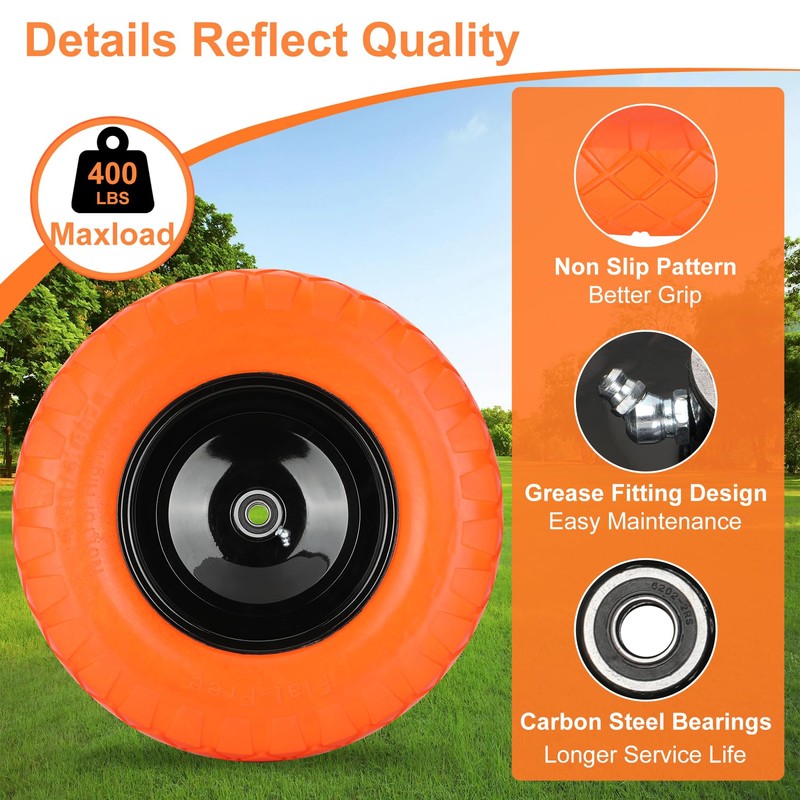 - Premium quality: The 16" solid tires are made of high-quality steel rims and durable polyurethane, which has excellent impact resistance and load-bearing capacity. It lasts 2-3 years longer than ordinary tires. A single tire can hold up to 400 pounds.