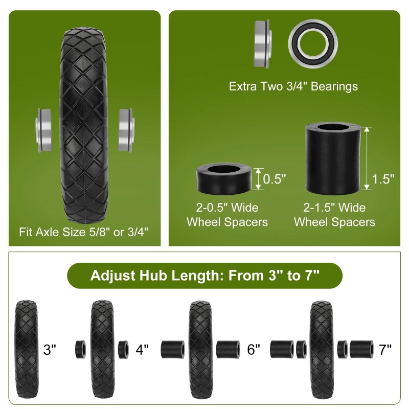 - Excellent design: Considering that the wheel and bearing sizes of different wheelbarrows are different, in order to make it more convenient for customers to design the 4.80/4.00-8 tire and wheel length to 3",the bearing size is 5/8 inch. We also added extension spacers and 3/4" bearings to it, this 16" flat free wheel is almost universal For all wheelbarrow types with hub length between 3" and 7".