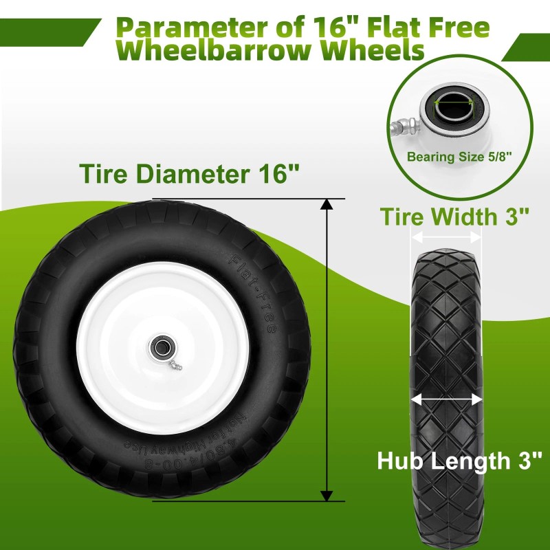 5/8″ ball bearing,3" hub length, 4.80 4.00-8 flat-free wheelbarrow tires are perfectly compatible with contractor-grade wheelbarrows, garden trailers, roofing equipment, spreaders, and more.16" flat free wheels are common for wheelbarrows with wheel sizes between 14" and 16".
