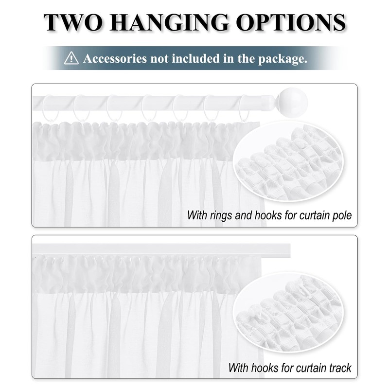 - Easy to mount: There are two methods for hanging: 1. Hang on the curtain pole with curtain rings and curtain hooks. 2. Hang it on a curtain pole with curtain rollers. Suitable for curtain poles, ceiling rails and cord tension systems.