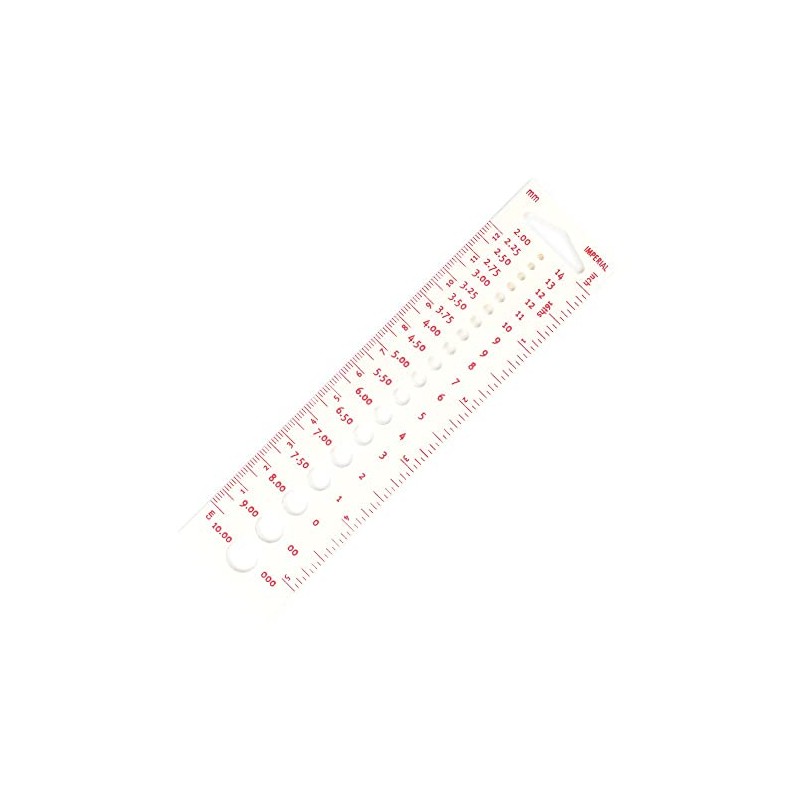 - This plastic standard size knitting gauge enables you to tell the size of your needles by simply inserting them into the holes