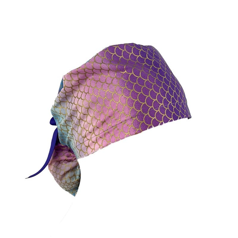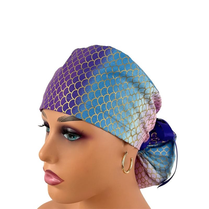 Ponytail Medical Scrub Cap – Mermaid Scales. - Turn Up Ponytail Scrub Hats, Bouffant, Unisex Surgical Caps, Dr. Hats, Nurses Hats. Scrub Hat for Women & Men tie Back | Working Cap with Holder