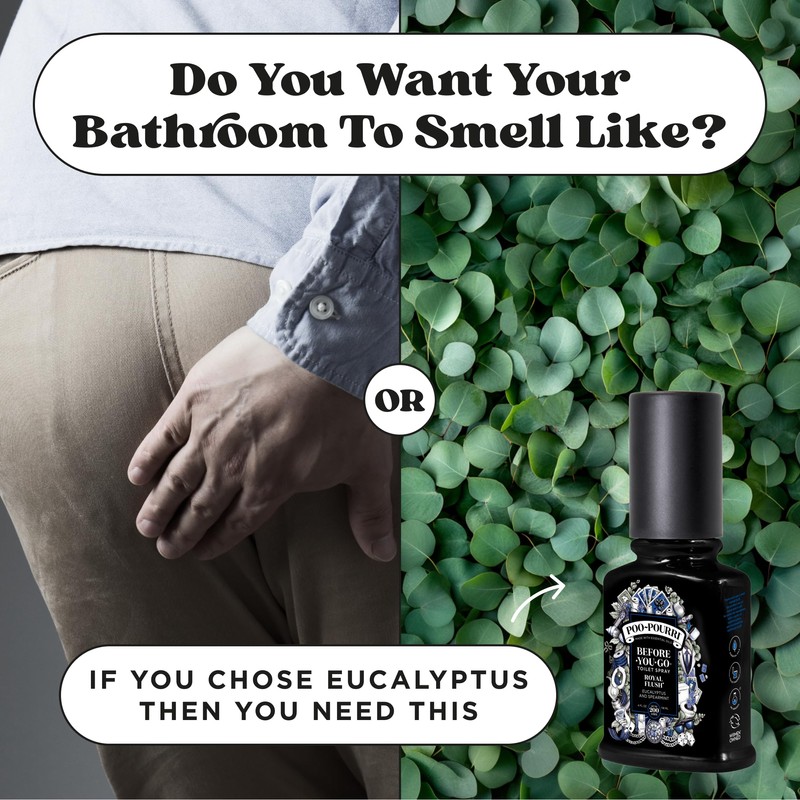 - Spritz the bowl before-you-go and no one else will ever know; our most popular scent! A great washroom scent for distinguished gents! Sometimes you have to raise the stakes to win the pot. Poo~pourri Royal Flush is a blend of eucalyptus and spearmint natural essential oils that eliminates bathroom odor before it begins by creating a barrier on the water's surface. So you'll always have an ace in the hole.