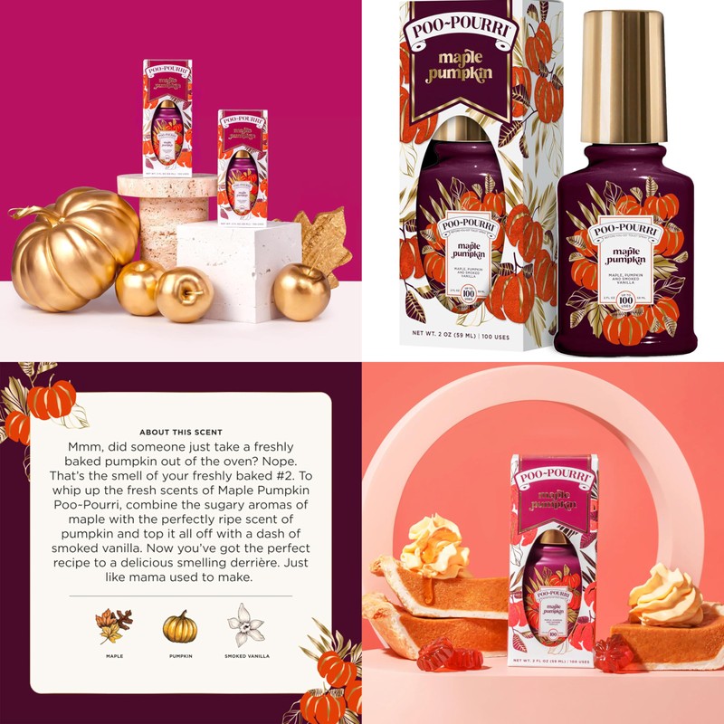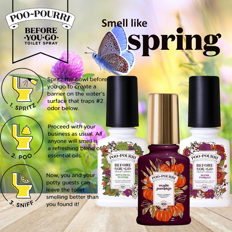 - Relax and unclench with poo pourri before you go toilet spray set; includes Maple Pumpkin 2 ounce Blush Florals 2 ounce and Botanical Waters 2 ounce