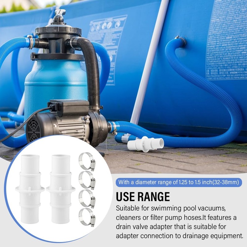- 【USE RANGE】With a diameter range of 1.25 to 1.5 inch(32-38mm), our pool hose adapter is suitable for swimming pool vacuums, cleaners or filter pump hoses.It features a drain valve adapter that is suitable for adapter connection to drainage equipment.