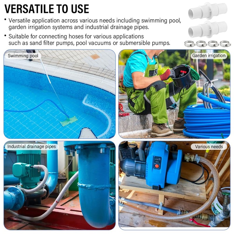 - 【VERSATILE TO USE】Versatile application across various needs including swimming pool, garden irrigation systems and industrial drainage pipes.Suitable for connecting hoses for various applications such as sand filter pumps, pool vacuums or submersible pumps.