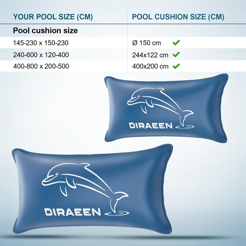 - 【4 ft. x 8 ft. 】Winter pool pillows are designed for larger pools and are easier and more cost-effective to install than using multiple smaller pillows.It fits all pool shapes (4-10 ft. x 18-20 ft.) and provides safe protection.