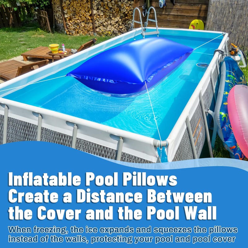 - PROTECT YOUR POOL DURING ALL WINTER:Inflate the pool cover pillow to 70–80 % of its full capacity so that, as freezing progresses, Our pool air pillow creates surface tension which allows your pool to freeze outside in instead of inside out. The ice expansion squeezes the pillow instead of the pool walls, can protect your pool and pool cover well