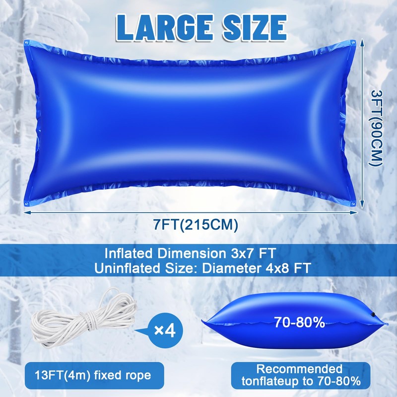 - PRODUCT INCLUDES: You will receive a 4x8 feet (uninflated) inflatable pool cover balloon and four 157.5 inch long tether ropes. The larger size provides better support for the pool cover and is suitable for various large underground or above-ground pools