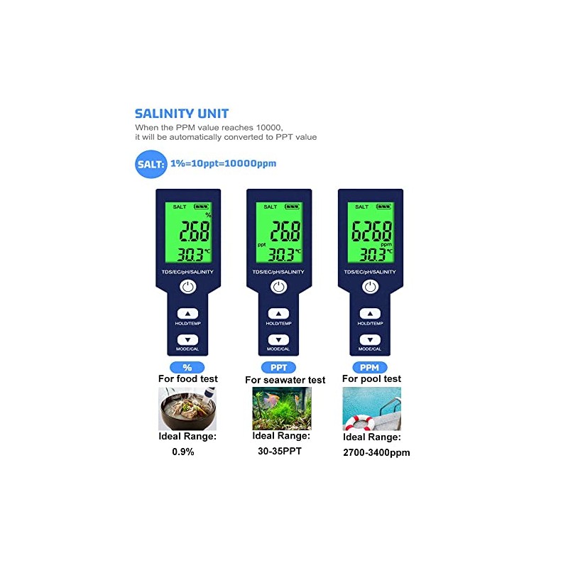 - Three Display Designs for Salinity Test: PPM + PPT + %. For Swimming Pool Salt Test : 0-9999ppm; Seawater Test: 10-200ppt (1ppt=1000ppm, when ppm figure is over 9999ppm, the meter automatically changes to ppt ). For Food Test : 0.01-25%. So you don’t have to calculate complex salt content level numbers between different units, which help you to avoid calculating mistake and also makes result-reading easier for you.