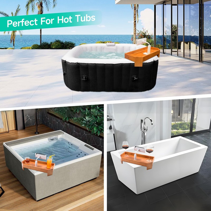 - Luxury Spa for Hot Tub - Essential at Your SideGet your drink in second without leaving the tub. The Hot Tub Tray Table keeps your wine glasses, phone, tablet, books and snacks within reach for a warm, relaxing spa experience. Suitable for most hot tubs, baths and jacuzzi. Fits Most Spas, a fantastic gift for anyone who enjoys a drink in an jacuzzi or hot tub.