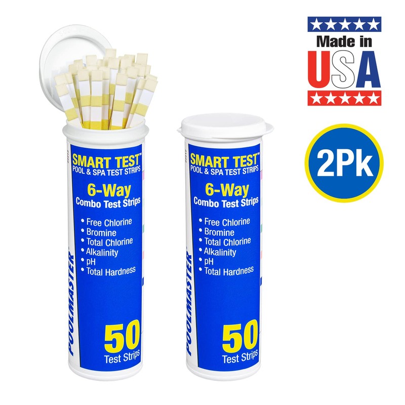 For maintaining your swimming pool or spa's chlorine levels and overall water chemistry, Poolmaster's Pool Water Test Strips and Pool Water Test Kits are a great choice. This 2-Pack of 6-Way Pool and Spa Water Test strips test for chlorine, bromine, pH, total alkalinity, total chlorine and total hardness and come with 100 strips for 100 pool water readings. The bottles feature an easy-to-read color chart and testing strips have no-bleed pads for quick, accurate color reading water test results. Just dip strip in pool or spa water for instant reading and adjust pool chemical levels as needed. These strips are proudly made in the USA. Poolmaster's Swimming Pool Collections consist of the essential must-have products for customary, easy and accurate pool and spa maintenance, constructed with durable materials designed to keep your pool sparkling clean.