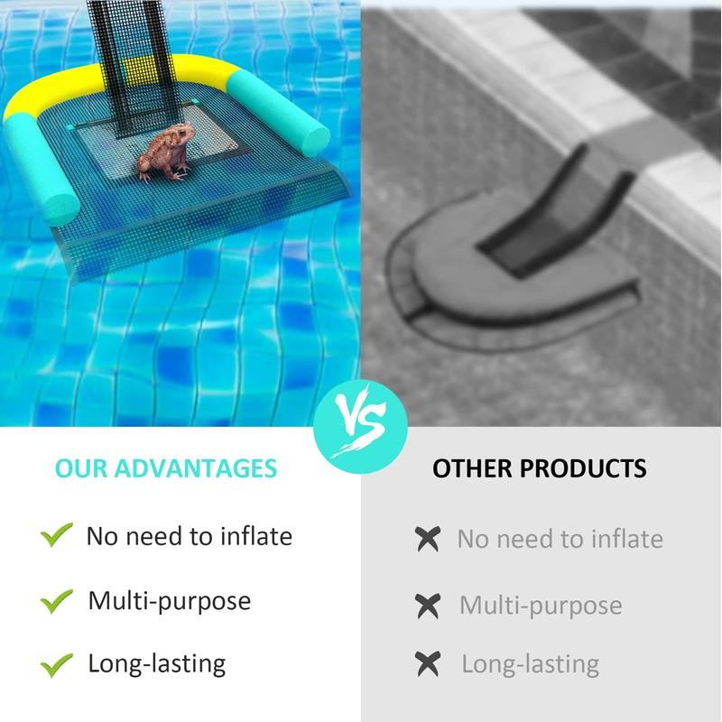 - Easy-to-install design: Unlike other brands, our floating ramp does not require inflation, making it easier and more convenient to use. Simply insert the floating noodle into the left and right sides, insert two black PE sheets into the sides of the ramp, fix sand and pebbles on the zipper bag, and then put frog pool ramp beside the pool for immediate use