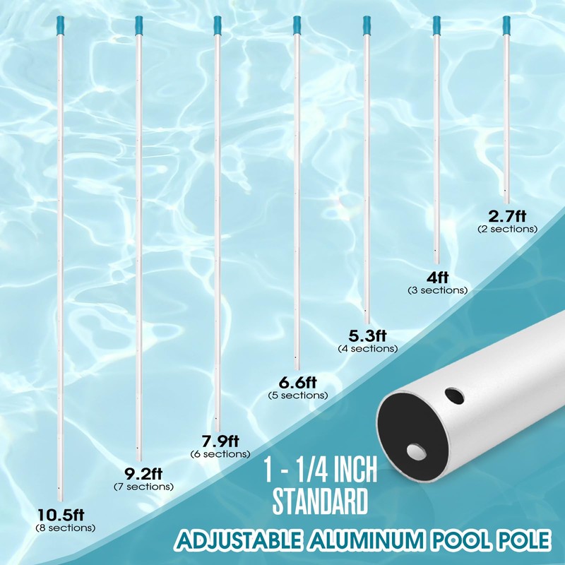 - POOL ALUMINUM POLE - Enduring and sturdy professional 0.8 mm commercial thickness aluminum swimming pool pole. The overlap of each aluminum pole connection was upgraded to make it stronger. Adjustable pool pole from 2.7Ft - 10.5Ft clean your pool from every angle. 1-1/4 standard pole size connection, connect attachments most pool maintenance accessories like nets, skimmers, rakes, brushes and vacuum heads.