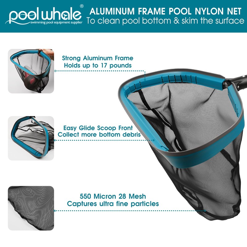 - EFFORTLESSLY COLLECT DEBRIS - Swimming pool nylon net has a 17.5 *9.5*14.5 in, upgraded angled front lip helps scooping out debris efficiently. Sturdy aluminum frame is made of a thick layer of aluminium on the inside and a thick plastic wrapped around the outside. Heavy duty nylon leaf skimmer net for pool cleaning is tapered for easy maneuvering. Medium mesh (550 microns 28 mesh) size will filter leaves & small debris, but won't remove silt & very small particles.