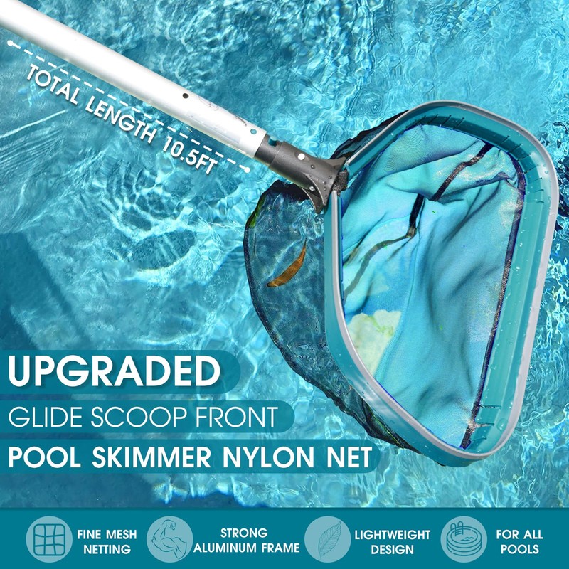 - PREMIUM POOL CLEANING KIT - Package includes 1 x 10.5ft adjustable aluminum pool pole, 1 x 17.5' heavy-duty pool curved wall brush head, 1 x 17.5" fine mesh pool skimmer rake net.