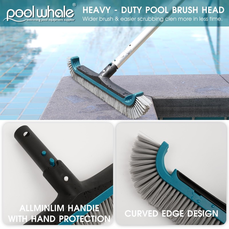 - KEEP POOL CLEAN BRUSH IT C 17.5' pool brush head with wide sweep area for efficient cleaning, the user-friendly handle is angled at 45 to present the brush in an ideal position for easy pushing. Curved edges allow for brushing along corners. scrub without damaging pool liners, nylon bristle brush helps you clean quickly and effectively. Corner, step, floor & pool wall cleaning was never easier.