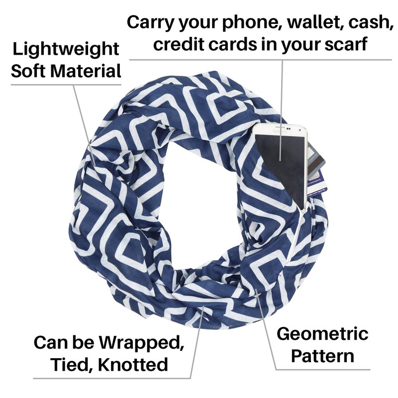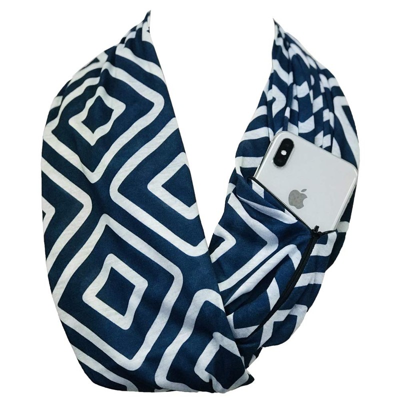Pop Fashion - Bufanda para mujer con estampado geométrico infinito, con bolsillo con cierre blanca, bufandas infinitas, Marino, Talla única