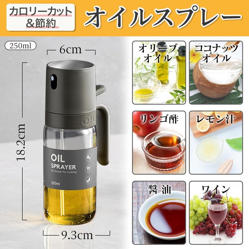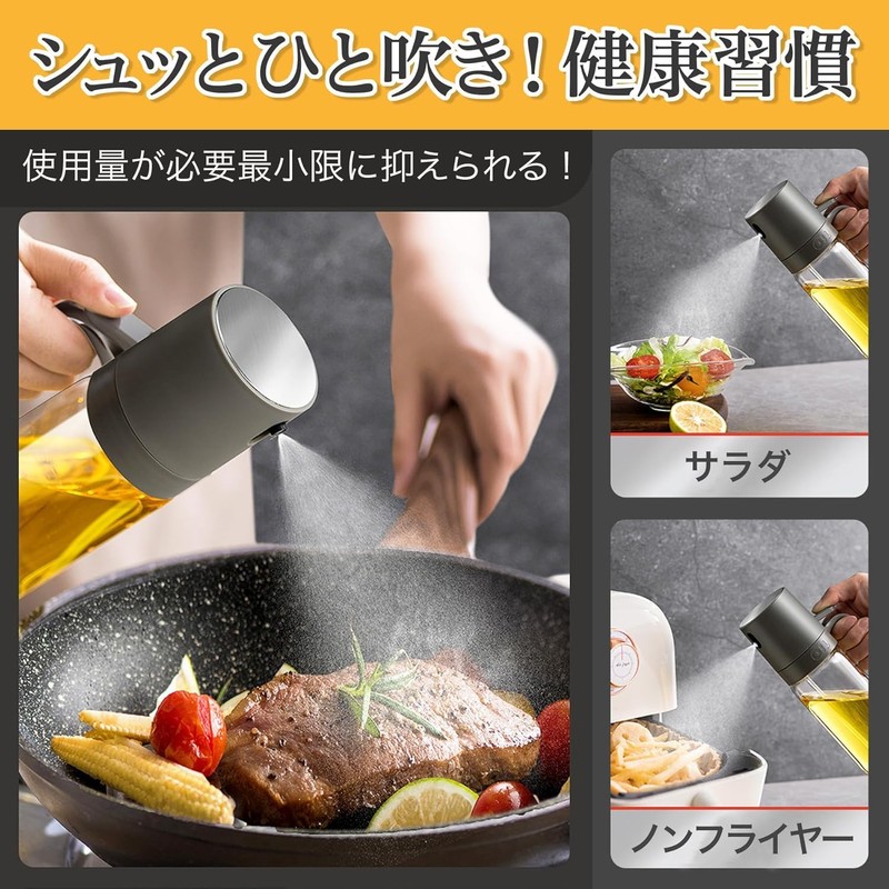 - 手軽に調理に使える油スプレー:調理中に食材に手軽に油をスプレーできる便利なオイルスプレーです。また液だれしづらい注ぎ口の形状となっております。
