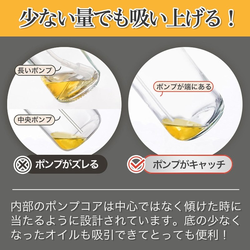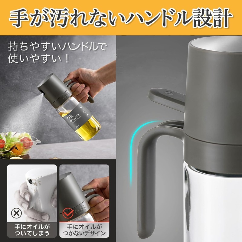 - 高品質素材:本体は食品グレードのガラス製で、油漏れの心配がありません。