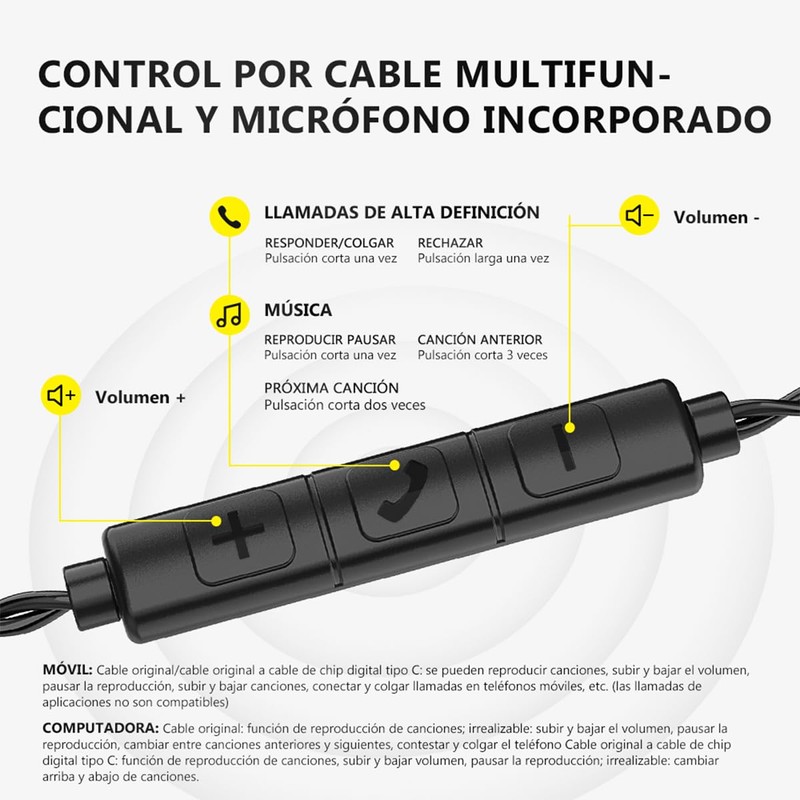 - [Control de línea multifunción, micrófono HD incorporado] El cable ajustable mejorado le permite reproducir y pausar música, subir y bajar canciones y subir y bajar el volumen.