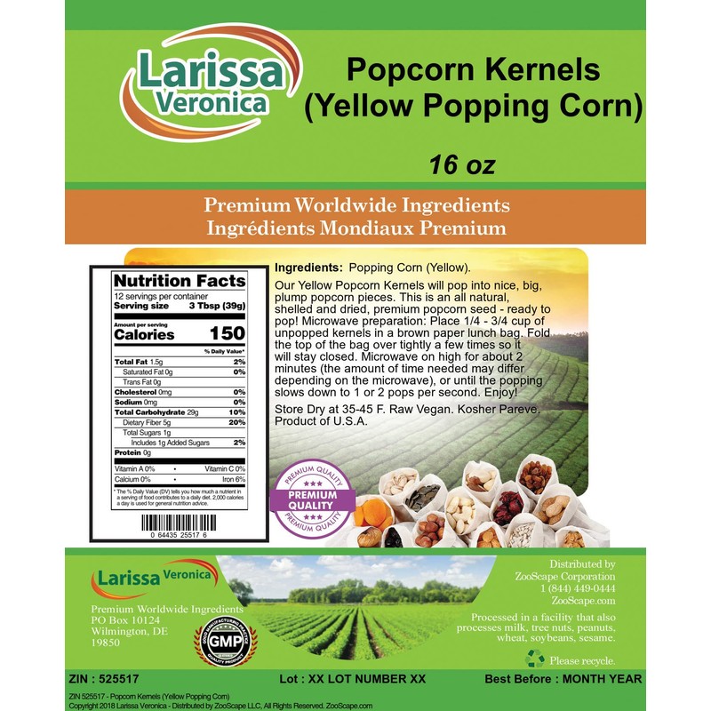 Our Yellow Popcorn Kernels will pop into nice, big, plump popcorn pieces. This is an all natural, shelled and dried, premium popcorn seed - ready to pop! - Microwave preparation: Place 1/4 - 3/4 cup of unpopped kernels in a brown paper lunch bag. Fold the top of the bag over tightly a few times so it will stay closed. Microwave on high for about 2 minutes (the amount of time needed may differ depending on the microwave), or until the popping slows down to 1 or 2 pops per second. Enjoy! - Larissa Veronica is an exclusive line of natural premium-quality products that use only the purest and finest ingredients from around the world. Larissa Veronica is hallmarked by the highest possible standards of purity, stability and freshness. All of our products are prepared with the highest elements of quality control, from raw materials through the entire manufacturing process, up to and including the moment that the bottles or bags are sealed for freshness and shipped out to you. Our highest possible standards are certified by independent laboratories and backed by our personal guarantee. - Larissa Veronica strives to make all products affordable and we are constantly researching the market to maintain our affordability and to look for new ways to serve you and the ones you love. Larissa Veronica has become a trusted household name for many families. - Larissa Veronica is packed in tamper-proof, food-grade, recyclable containers. - ZooScape is proud to be the exclusive distributor of all Larissa Veronica spices, snacks, foods and ingredients in the United States, Canada and around the world. - Store Dry at 35-45 F. Raw Vegan. Kosher Pareve. Product of U.S.A.