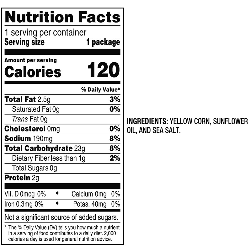 - SIMPLE INGREDIENTS: Made with three ingredients, and no artificial flavors, colors, or preservatives- Yellow Corn, Sunflower Oil, and Sea Salt