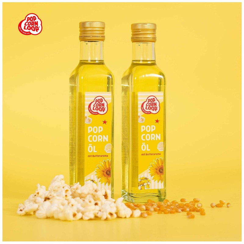 Popcornloop Popcorn Öl für Mais 250 ml Flaschen Hocherhitzbar Butter High Oleic Fett mit Butteraroma Buttergeschmack Oil Omega Hocherhitzbares Bratöl Popcornmaschine Zucker Salz Rapsöl Sonnenblumenöl