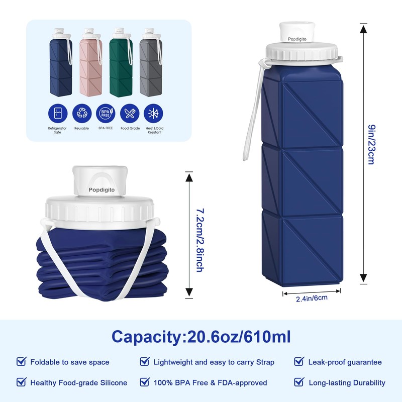 Popdigito Collapsible Water Bottles,20.6oz Silicone Foldable Leakproof BPA Free Reusable Lightweight Portable Sport Water Bottles For Travel,Camping,Hiking,Outdoor Indoor,Detachable for Dishwasher