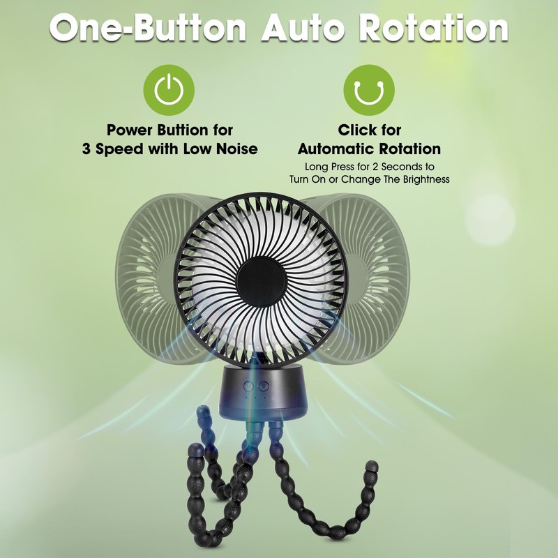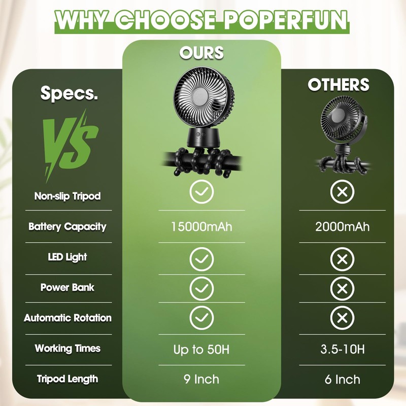 POPERFUN 50H Portable Stroller Fan, 15000mAh Ultra-Long Battery Powered Rechargeable Personal Fans, Tripod Clip Fan with Auto Rotation,3 Speed Desk Handheld Cooling for Travel Car Seat Bedroom