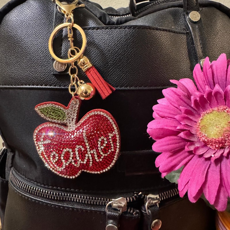 Popfizzy Teacher Keychain Accessories for Women, Rhinestone Red Apple Backpack Charm, School Bag Charm, Bling Teacher Gifts