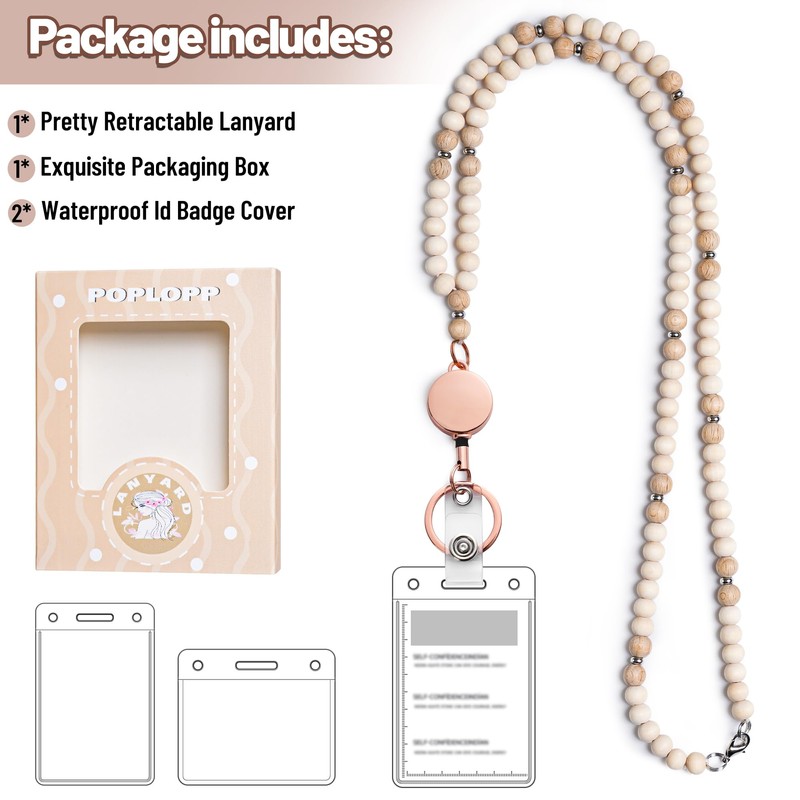 POPLOPP Teacher Lanyard with ID Holder and Retractable Badge Reel for Keys, Wooden Beaded Keychain Lanyard, Lanyards for Id Badges for Women Cute